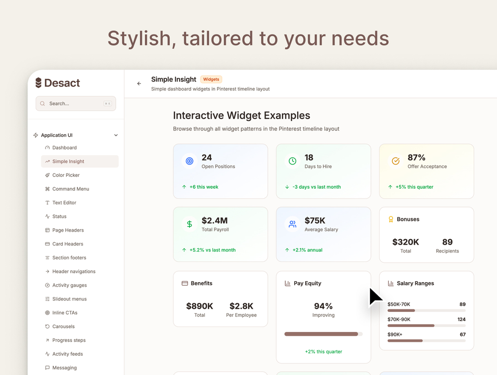 Insightful widget templates built from real use cases in recruiting, payroll, and team management apps. -